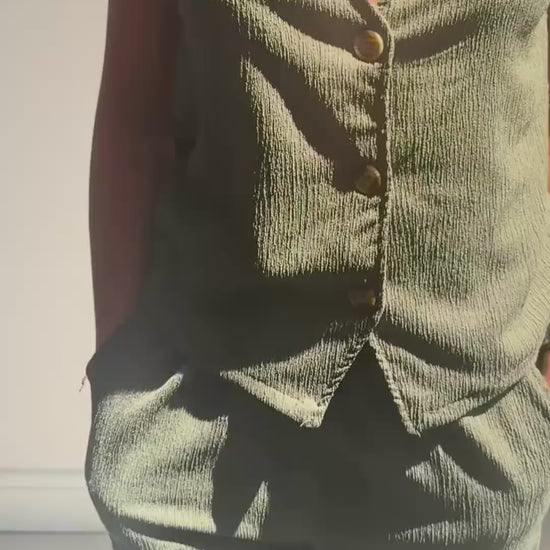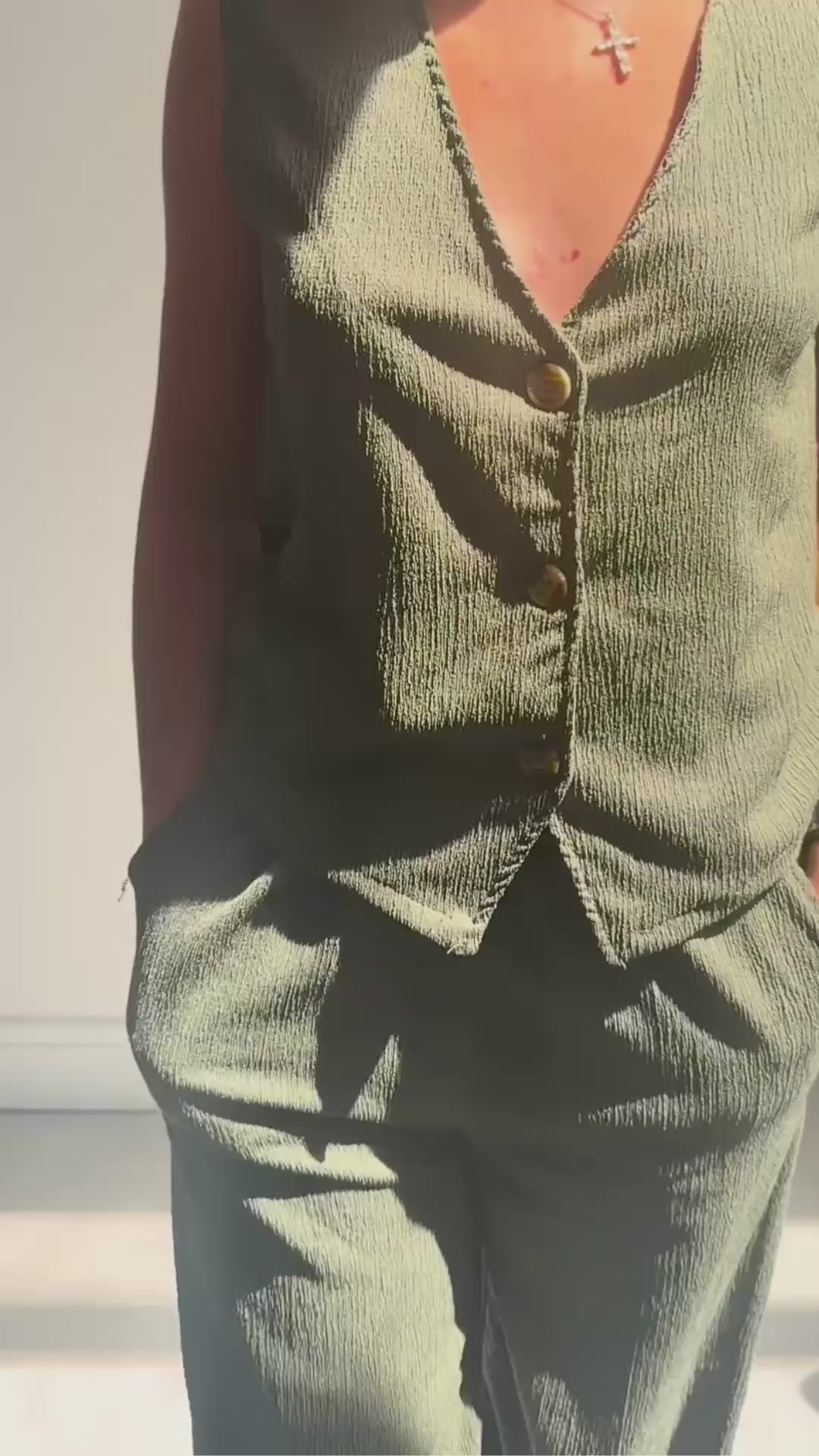 Tailored sophistication meets contemporary flair in this coordinated set. Featuring a textured waistcoat with a flattering fit and sleek button detailing, paired with high-waisted, wide-legged trousers that flow with every step, this duo is designed to make a statement. Perfect for both power dressing and elevated casual wear, the set offers timeless versatility with a modern edge. Dress it up with heels or keep it cool with flats—style it your way.